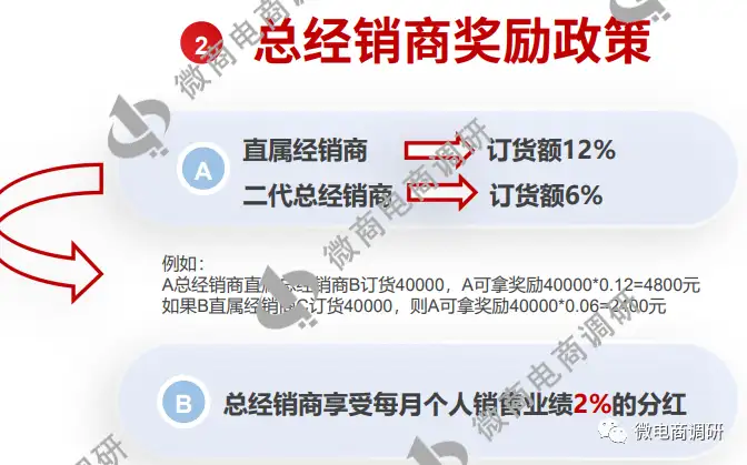 总代理享受直属经销商订货额12%的奖励,二代总经销商订货额8%的奖励;总代还享受每月个人销售业绩2%的分红。