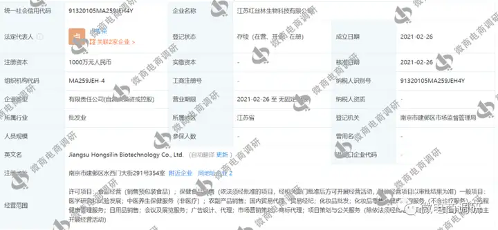 据调查,微信公众号“红丝林”的经营主体为江苏红丝林生物科技有限公司。据企查查显示,江苏红丝林生物科技有限公司成立于2021年2月26日,注册资本1000万,法定代表人为卢秀荣,卢秀荣也为该公司大股东,持股89%,其他两位股东分别是王鹏和邵霞。所属行业为批发业,公司经营范围包含食品经营,保健食品销售,医学研究和试验发展及中医养生保健服务等业务。