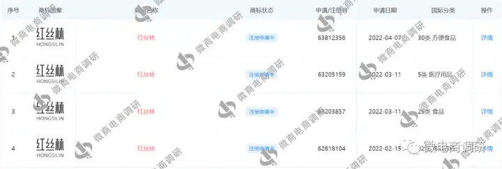 值得注意的是,江苏红丝林生物科技有限公司旗下关于“红丝林”商标种类包括方便食品、医疗用品、食品及啤酒饮料这四种类别。但是目前这四类商标状态均为注册申请中。
