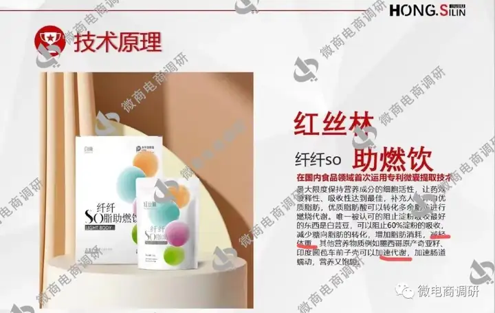 作为红丝林旗下最热销的产品SO脂助燃饮,这款产品定位为“国内食品首次运用专利微囊提取技术”的产品,宣传可以减轻体重,加速代谢。