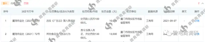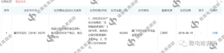 此外,厦门仟草食品科技有限公司也曾因用超过保质期的食品原料、食品添加剂生产食品、食品添加剂被罚款50000元的行政处罚。