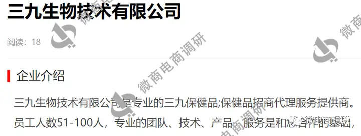 但是据企查查显示,三九企业集团旗下控股企业高达三百多个,但并不包含三九生物技术有限公司。调查得知,三九生物技术有限公司只是一个保健品招商代理服务提供商,企业地址是安徽阜阳市颍州区阜阳市颍州路百福大厦三楼,且公司员工也只有100人。