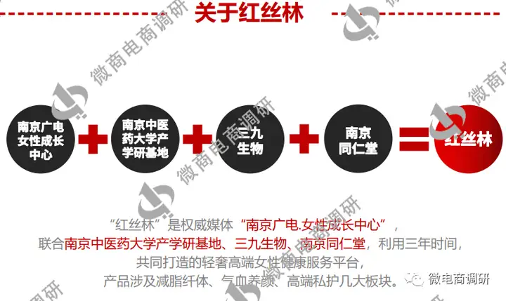 此外,红丝林宣传是“南京广电 女性成长中心”联合南京中医药大学学研基地、三九生物、南京同仁堂,共同打造的高端女性健康服务平台。红丝林也在其商城宣传其与三九企业集团控股的三九生物技术有限公司达成合作伙伴关系。