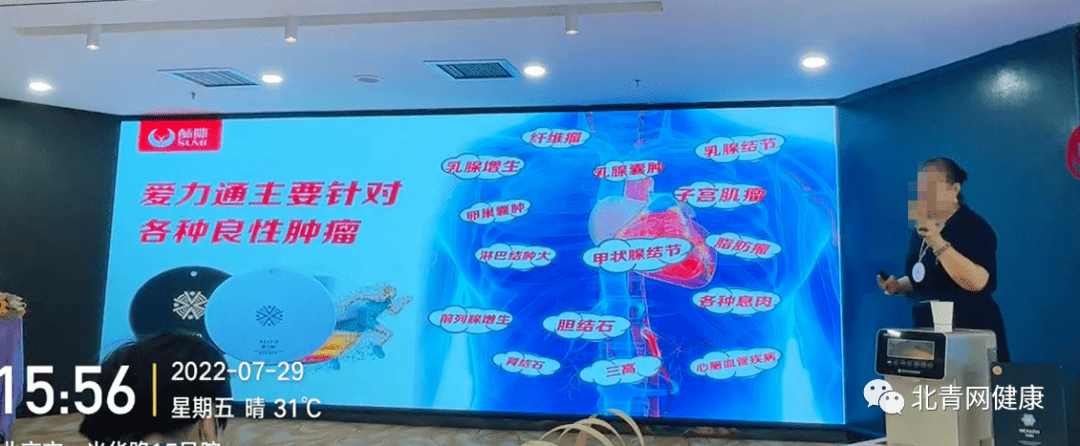 会上,一位脖子上挂着白色爱力通的“老师”配合演示文稿高声介绍,“爱力通生物共振器是高科技产品,5分钟内能把结节肿瘤变软变小;经络淤堵长出来的结节、瘤子,以及乳腺增生、乳腺炎等胸部问题,子宫肌瘤、卵巢囊肿等妇科问题,阳痿、早泄等男科问题……都可以通过爱力通调理好”。