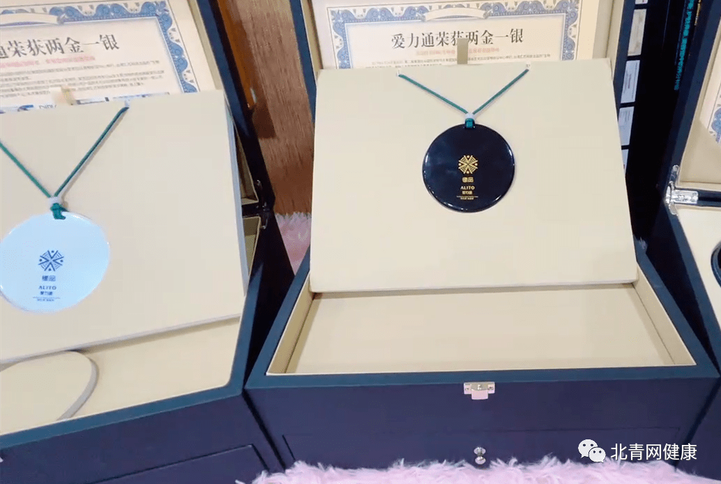 本网在现场看到,杨女士所说黑色“圆形挂牌”为无肌肽爱力通生物共振器(简称“爱力通”),有黑色和白色两款,产品由圆形共振器、手持共振器、挂绳等组成。