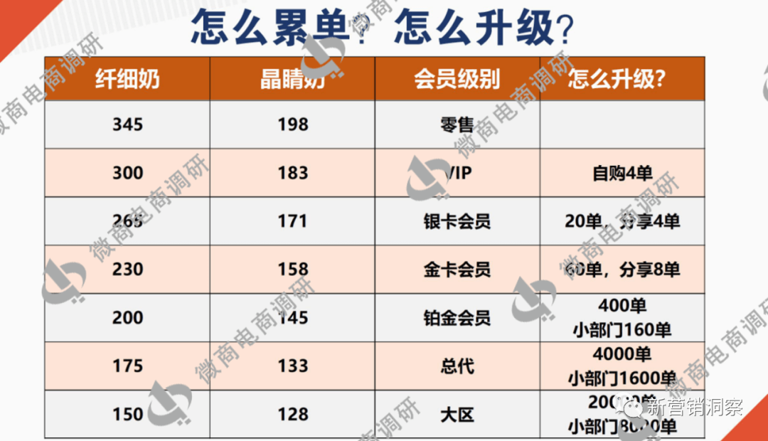 文章的最后,我们再来关注一下哈哈晶睛商城推行的奖金制度该如何解读。据推广人员阿强(化名)提供的资料显示,哈哈晶睛商城将参与者主要分为了六大职级,分别是VIP、银卡会员、金卡会员、铂金会员、总代、大区。不同级别对应的拿货价自然不同,我们以“纤细奶”为例,该产品零售价为345元,VIP拿货价为300元,银卡会员的拿货价为265元,金卡会员的拿货价为230元,铂金会员的拿货价为200元,总代的拿货价为175元,大区的拿货价为150元。据知情人透露,在大区之上,还有一个隐藏级别叫联创,同时发展四条线,每条线上出一个大区,即可升级为联创。