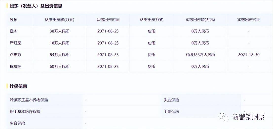 一晃多年过去,当时间来到2023年2月19日,哈哈晶睛商城“趁势而上大展宏兔”主题年会正式在广西南宁举行,这场会议又被称作是“2023哈哈晶睛飚速启航盛典”,至此,有关娃哈哈飚能的宣传才开始相继出现在互联网上。经查,上架了娃哈哈飚能这款产品的哈哈晶睛商城的经营主体为杭州哈哈晶睛科技发展有限公司,该公司成立于2021年8月30日,法定代表人严红星,股东有卢惠方(大股东)、陈夏阳、章杰、严红星,注册资本200万元,据2021年度报告显示,该公司股东们的实缴出资情况与员工参保情况如下: