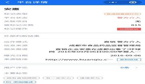 本网注意到,在“腾讯灵鲲金融风险查询举报中心”查询发现“安惠”标记类型:有违规直销行为;平台状态:警方介入;标记操作:认同标记;被标记次数:815次。主要标签:拥有直销牌照,有一定实力,谨慎参与。
