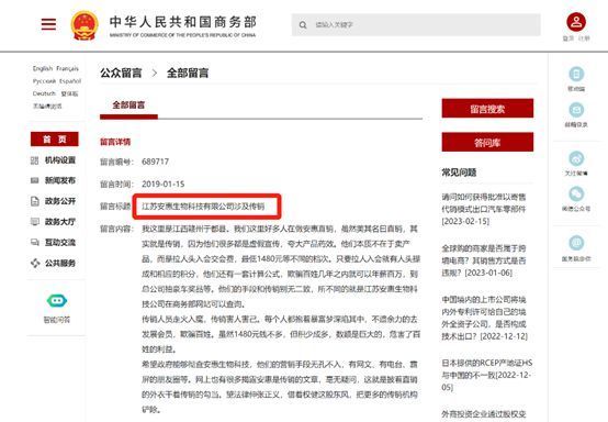 在商务部官网,本网注意到,2019年1月15日,曾有网友留言爆料江苏安惠生物科技有限公司涉及传销。网友自称来自于江西赣州于都县,安惠直销在当地大行其道,本质不在于产品销售而是拉人头交会费。并且大多虚假宣传,夸大产品药效。希望政府部门介入对安惠生物进行彻查。