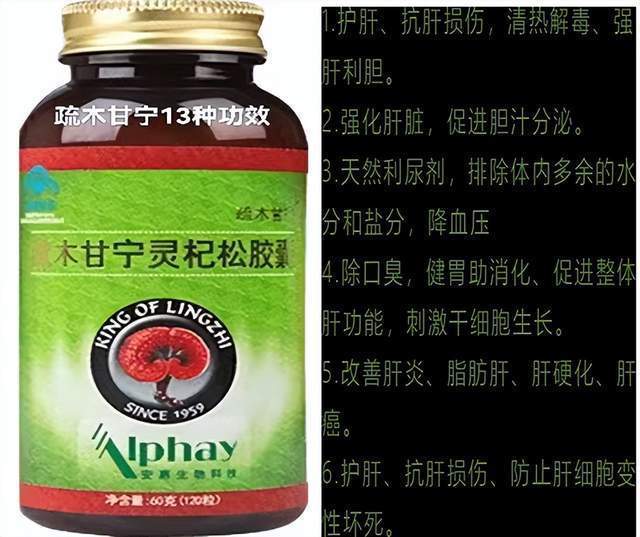 而这款名为疏木甘宁灵杞松胶囊的保健食品更是具有清热解毒、强肝利胆、护肝保肝、利尿降压、除口臭健脾胃等13种功效。