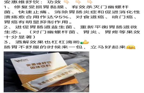这款名为安惠维舒饮固体饮料,被经销商宣传为具有修复受损胃黏膜、有效杀灭幽门螺旋杆菌、快速止痛、消除胃肠炎症和促进消化性溃疡愈合作用达95%、并称对食道癌、喷门癌、胃癌有明显抑制作用。