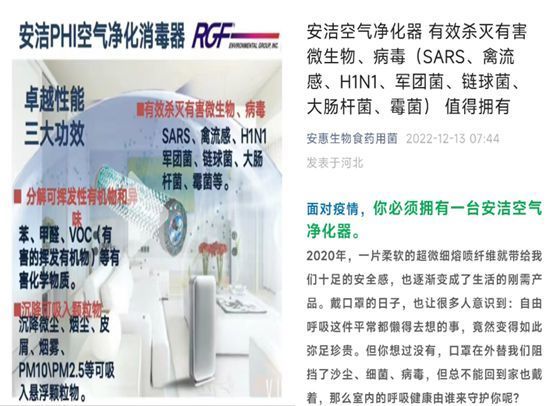 除此之外,安惠公司销售的安洁空气净化消毒器自称中国首个获得卫生部颁发的消字号卫生许可批件【卫消进字(2007)第0002号】该产品能有效杀灭有害微生物、病毒(SARS、禽流感、H1N1、军团菌、链球菌、大肠杆菌、霉菌)等。