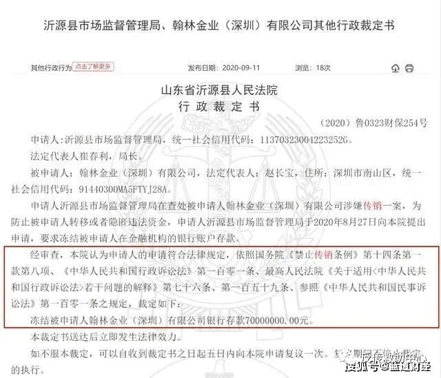 从上面的图片是不是觉得翰林金业(深圳)有限公司和晨和金宜莱(山东) 黄金珠宝有限公司的模式基本一样,只是修改了数字和细节名称而已?而这个翰林金业于9月11日,被沂源县市场监督管理局查处涉嫌传销,冻结翰林金业的银行账户存款7000万。