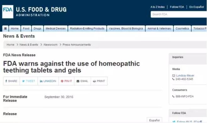 在此之前,FDA对10名婴儿死亡和400多起癫痫发作、发烧和呕吐进行调查,发现这些症状很可能与海兰德公司生产的出牙片有关。该公司声称这是一种能帮助婴儿暂缓出牙不适症状的顺势疗法产品。