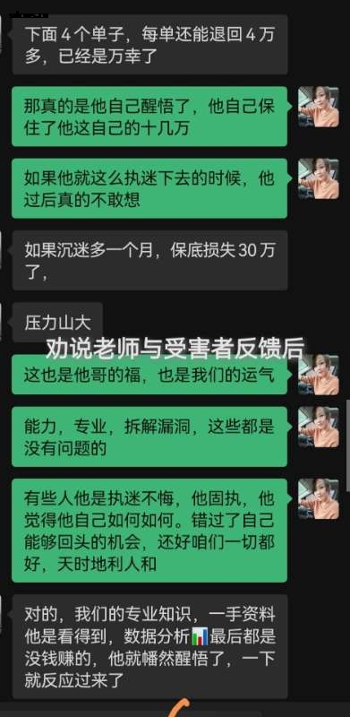 最终,在现实的证据和我们植入的逻辑下,他彻底认清了骗局的真相,主动给求助者打了电话,承认自己被骗,坦言自己已经提交了离职,也彻底断了继续发展亲友入局的念头。